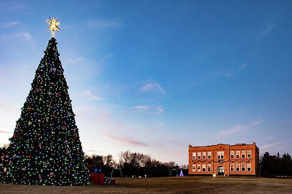 A large Christmas tree in Bedford, Texas is adorned with colorful holiday lights. It stands prominently on the left, while a brick building (the rebuilt Old Bedford School) is visible in the distance on the right. The sky is clear with a hint of dusk, creating a festive and serene atmosphere.